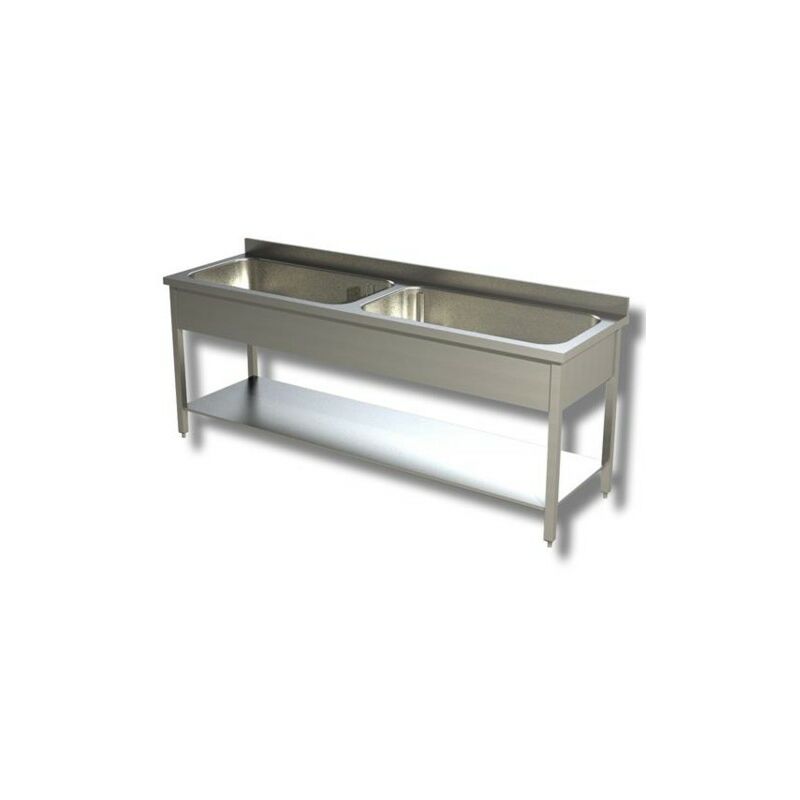 Codice RS4719 - Lavello lavatoio su gambe e piano di fondo, modello RP-DSLG2VX186, costruito in acciaio inox 430, dimensioni cm. 180x60x85 (lxpxh), n.2 vasche dim. cm. 80x50x35 (lxpxh). Vasca stampata spessore 1 mm, piano con spessore 40 mm, alzatina posteriore spessore 20 mm e altezza 100 mm. Gambe con profilo quadrato 40x40 mm con piedini regolabili in altezza. Fornito in kit smontato. In dotazione: piletta di scarico d. 46 mm e tubo troppo pieno.