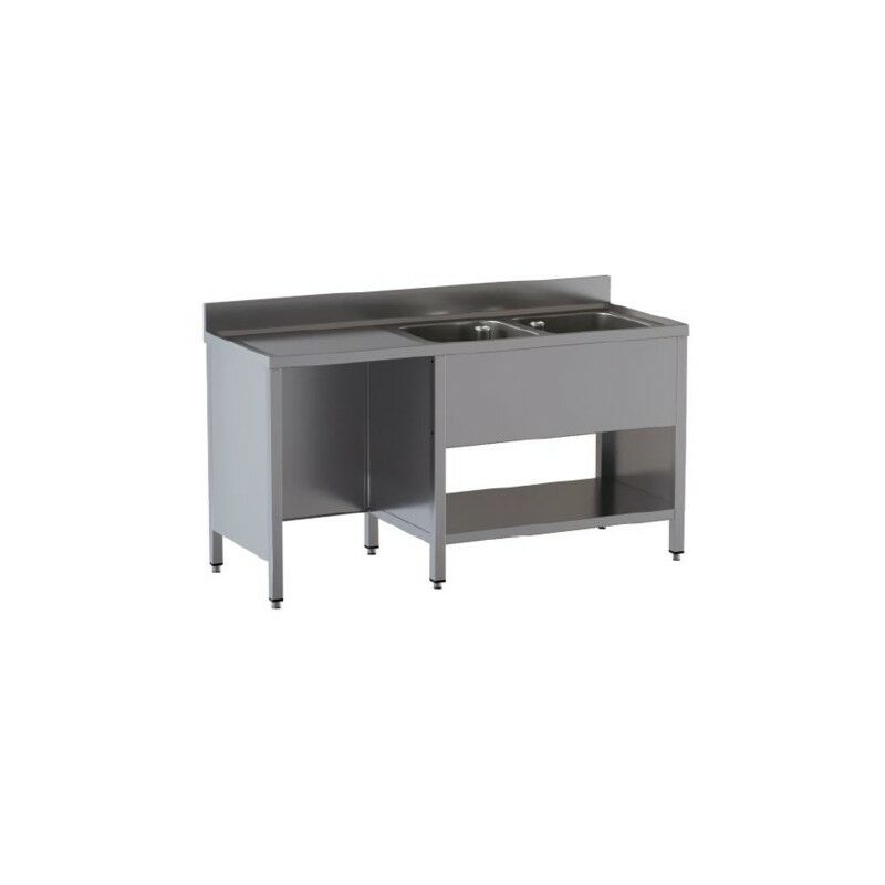 Codice RS5069 - Lavello lavatoio su fianchi e piano di fondo, modello RP-DSLF2VPSX187, costruito in acciaio inox 430, dimensioni cm. 180x70x85 (lxpxh), n.2 vasche dim. cm. 50x50x30 (lxpxh), sgocciolatoio SX, vano pattumiera. Vasca stampata spessore 1 mm, piano con spessore 40 mm, alzatina posteriore spessore 20 mm e altezza 100 mm. Gambe con profilo quadrato 40x40 mm con piedini regolabili in altezza. In dotazione: piletta di scarico d. 46 mm e tubo troppo pieno.