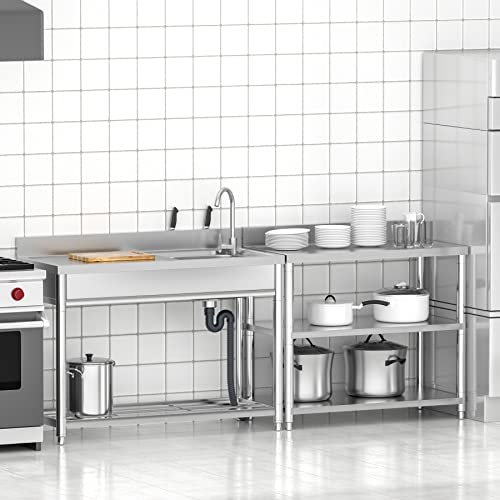 ✔[Lavello Industriale con Banco di Lavoro] - Grazie all'ampio banco di lavoro e al ripiano inferiore, questo lavello professionale può migliorare notevolmente l'efficienza del lavoro in cucina. I piedini del supporto possono essere regolati per adattarsi a terreni irregolari, adatto per uso esterno e interno. Paraspruzzi posteriore impedisce all'acqua sporca di macchiare la parete e il bordo rialzato intorno al lavabo impedisce all'acqua di traboccare. I bordi arrotondati prevengono le lesioni.