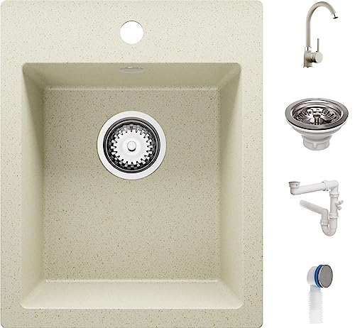 Lavello Cucina 50x50 cm, Lavandino Cucina in Granito 1 vasca + Rubinetto + Sifone Classico, Lavabo Cucina ad incasso Riga 40 XL di Primagran, Beige