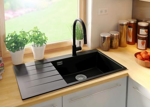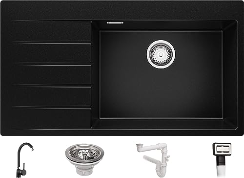 Lavello Cucina Nero 90x50 cm, Lavello in Granito 1 Vasca + Set di Scarico + Rubinetto, Lavello al mobile 60cm, Lavello ad Incasso di Primagran