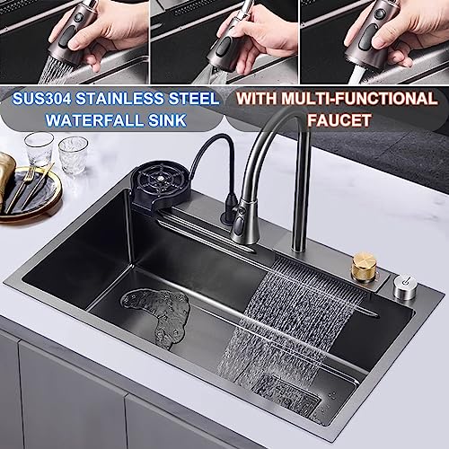 Lavello da cucina in acciaio inossidabile 304 per lavello a vasca singola con rubinetto estraibile a cascata e set di accessori completo a doppio montaggio (dimensioni: 68 x 45 x 22 cm)