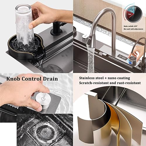 Lavello Da Cucina Nero Lavello In Acciaio Inox Rubinetto A Cascata Digitale Lavello A Vasca Singola Tutti Gli Accessori Inclusi (S: 75x45cm)