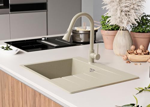 Lavello Cucina Beige 62x50 cm, Lavello in Granito 1 Vasca + Set di Scarico, Lavello al mobile 40cm, Lavello ad Incasso di Primagran