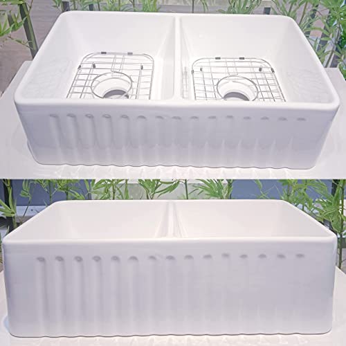 [Argilla di alta qualità]: questo lavello da cucina bianco da fattoria è realizzato in vera argilla ignifuga, una speciale argilla bianca che viene cotta ad alta temperatura per una resistenza e una durata estremamente elevate. La superficie del lavello della cucina ha una forte resistenza a scheggiature, abrasioni, graffi e scolorimento e può mantenere prestazioni belle e affidabili per molti anni.