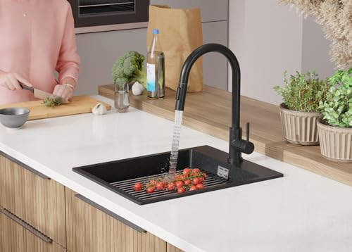 Lavello Cucina Grafite 43x53 cm, Lavello in Granito 1 Vasca + Set di Scarico + Rubinetto, Lavello al mobile 45cm, Lavello ad Incasso di Primagran