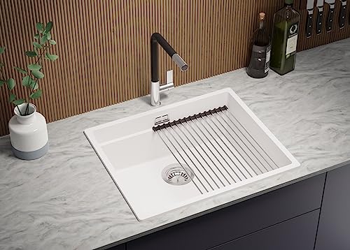 Lavello Cucina 56 x 47 cm, Lavandino Cucina Composito 1 vasca + Rubinetto + Sifone Automatico, Lavabo Cucina Incasso Prague 60 Slim Level di Primagran, Bianca