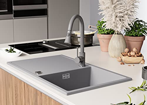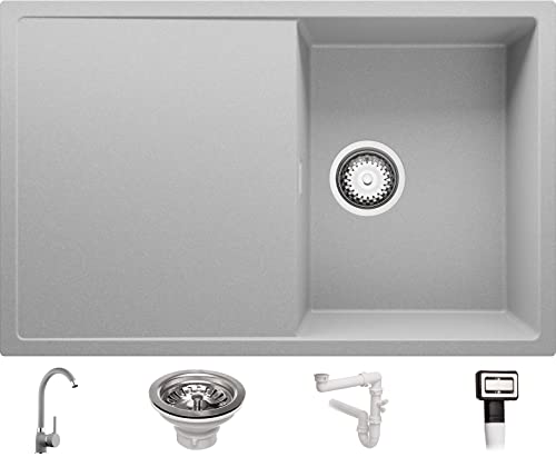 Lavello Cucina 78 x 50 cm, Lavandino Cucina in Granito 1 vasca + Rubinetto + Sifone Classico, Lavabo Cucina Incasso Ibiza di Primagran, Grigio