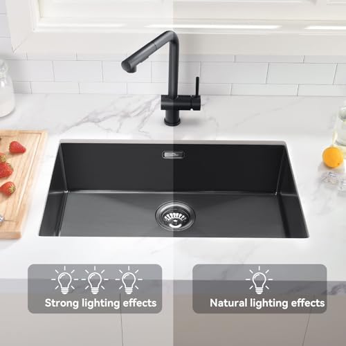 Lavello Cucina 1 Vasca 70 x 44 cm, Auralum Lavandino Cucina in Acciaio Inox, Lavabo Cucina da Appoggio, Incassoda o Filotop, Lavello Vasca Singola Con Kit di Scarico, Nano Nero