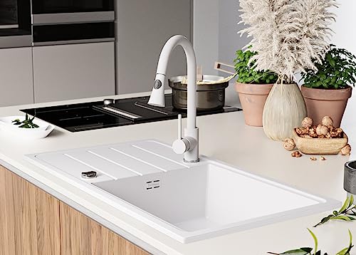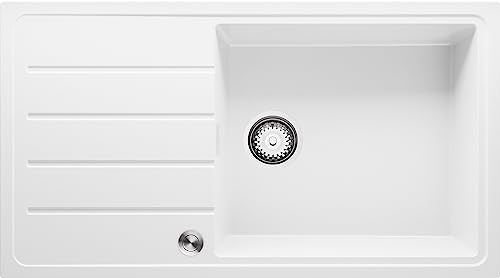 Lavello in Granito 90 x 50 cm, Lavandino Cucina 1 vasca + Sifone Pop-Up, Lavabo Cucina Incasso di Primagran, Bianca