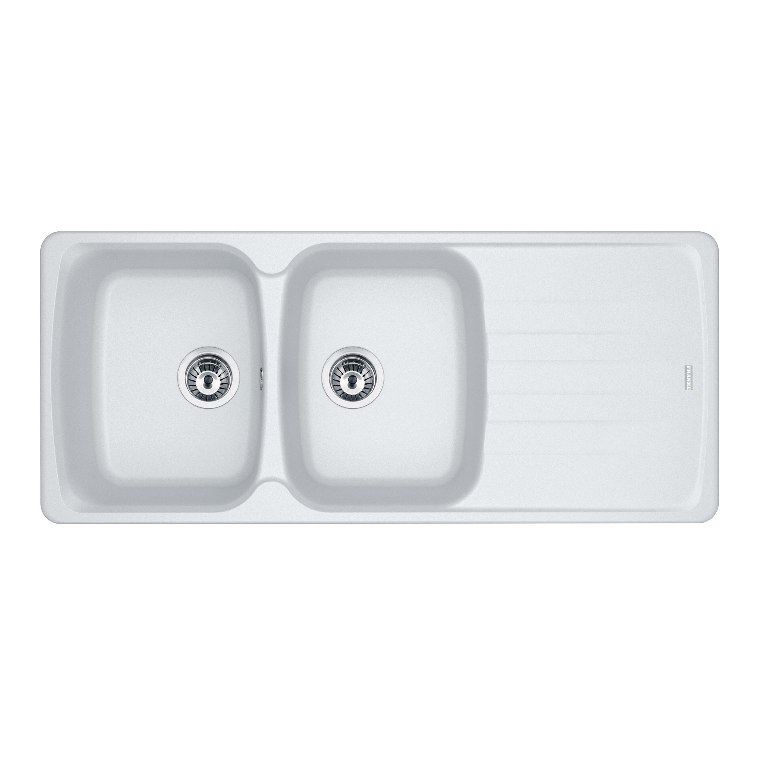 Lavello in fragranite,resistente a graffi, urti, macchie e calore. Superficie antibatterica, reversibile, con troppopieno rotondo, colore bianco