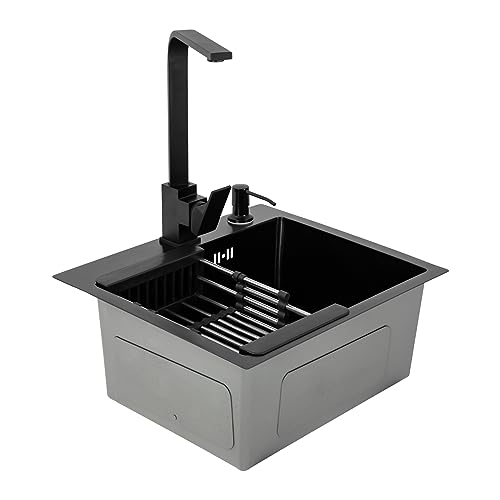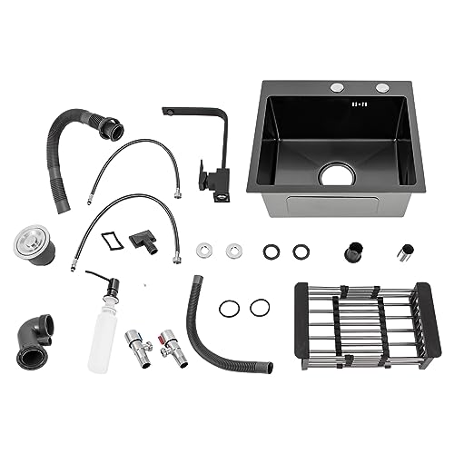 Lavello nero con rubinetto, in acciaio inox, con erogatore di sapone, cestello di scarico per acqua calda e fredda, lavello singolo da incasso, 45 x 40 cm, protezione da troppopieno