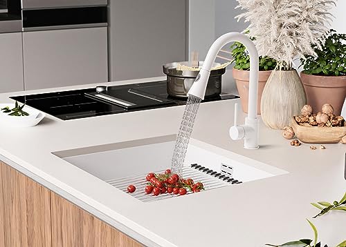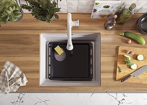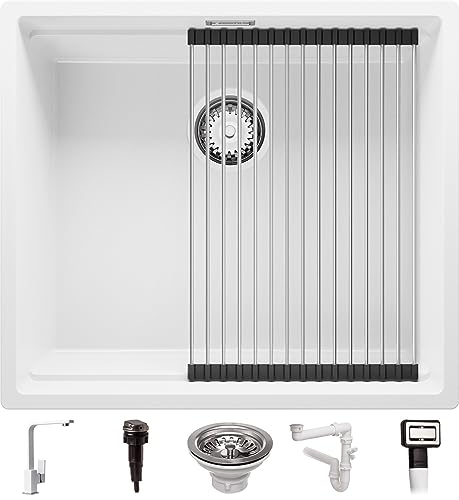 Lavello Sottopiano Bianco 56x50 cm, Lavello in Granito 1 Vasca + Set di Scarico + Rubinetto, Lavello al mobile 60cm, Lavello di Primagran