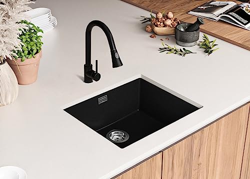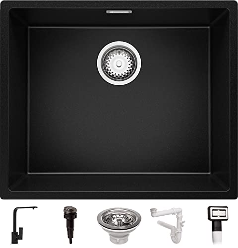 Lavello sottotop nero 56 x 47 cm, lavello in granito una vasca + miscelatore per lavello + sifone automatico, lavello da cucina London 60 di Primagran