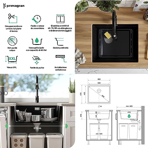 Lavello Sottotop 56 x 47 cm, Lavandino Cucina in Granito 1 vasca + Sifone Classico, Lavabo Cucina Incasso Prague 60 XL Level di Primagran, Tutto Nero