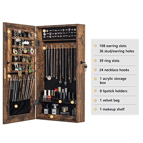 LAVIEVERT Armadio per gioielli con serratura con specchio senza cornice, a parete/porta, organizer per gioielli con scomparti per rossetto, colore: marrone rustico