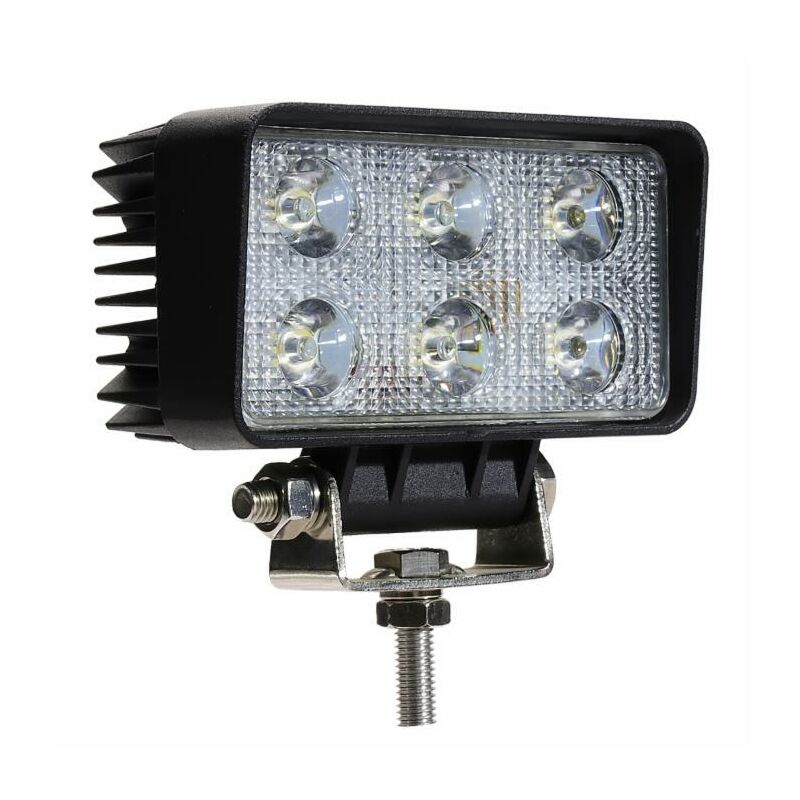Faro da lavoro a LED con potenza di 18 W. Questo modello, rettangolare dalle dimensioni di 110x50x114,5 mm, proietta in uscita un flusso di luce fredda a largo raggio. Dispone di un corpo in alluminio, di una lente realizzata in PMMA, di 6 LED di tipo Epistar, di una staffa per il fissaggio in acciaio inossidabile e di un cavo di alimentazione lungo 40 cm. Il proiettore è coperto da un grado di protezione IP67 ed è certificato CE, RoHS, R10 e CISPR25 classe 2. Caratterizzato da una tensione nominale di 10-36 V, da una temperatura colore di 6000-6500 K, da una temperatura d'esercizio da -40°C a +60°C, da un assorbimento di corrente di 1,15 A a 12 V e 0,55 A a 24 V ed è provvisto di 1350 lumen (LM). Si tratta di uno strumento fondamentale in quanto fornisce l' illuminazione necessaria per lavorare in ambienti poco illuminati o bui. Inoltre garantisce maggiore sicurezza, riducendo il rischio di incidenti, andando ad individuare ostacoli o pericoli presenti nell'ambiente. Alimentazione