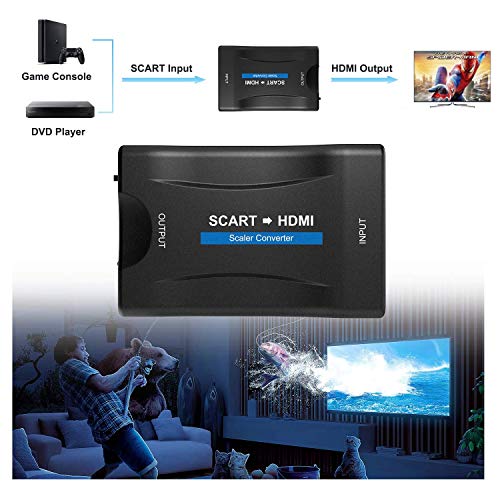 ➤ Ampia compatibilità: formato di ingresso SCART PAL, NTSC3.58, NTSC4.43, SECAM, PAL/M, PAL/N formati TV standard. Adatto per DVD, Sky box, N64, VHS, PS1/2, VCR, Wii, Blu-ray ecc. Formato di uscita HDMI: supporta l'uscita 720p/1080p, compatibile con HDMI 1.3. Adatto per HDTV, proiettore, monitor ecc.