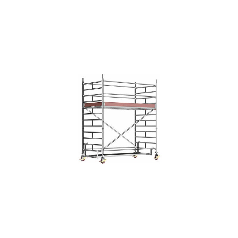 Trabattello universale, versione larga, altezza del trabattello 3,43 m. Fornitura = smontato. Lunghezza piattaforma = 2850 mm. Altezza di lavoro = 4.2 m. Altezza di salita = 2200 mm. Altezza trabattello = 3.43 m. Peso = 187.1 kg. Materiale = alluminio. Portata = 2 kN/m². Norma = DIN EN 1004-1. Tipo di prodotto = trabattelli mobili standard. Grande superficie d'appoggio per lavorare comodamente. Leggeri, robusti, durevoli. Per altezze elevate. Rotelle regolabili per la messa in piano. Sicurezza garantita dal controllo TÜV. Impalcatura universale con rotelle in versione larga, ideale come postazione di lavoro in altezza. Spaziosa piattaforma per lavorare in modo ottimale con materiali ingombranti. Scale (larghezza 1,5 m) in alluminio per un facile montaggio a innesto. Le ringhiere e le diagonali in alluminio si incastrano rapidamente. Superfici di passaggio con telaio in alluminio e inserto in compensato per un accesso sicuro. Robuste rotelle pivottanti con applicazione centrica del