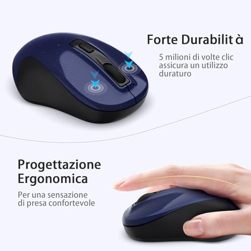 【Clic silenzioso e sensazione di mano confortevole】 Clic silenzioso Il mouse con un design classico con finitura anti-impronta offre alla tua mano il massimo supporto e comfort. Il pulsante silenzioso riduce i rumori del 90%, il che lo rende un mouse wireless ideale per ufficio, sala conferenze, bar, biblioteca, camera da letto.