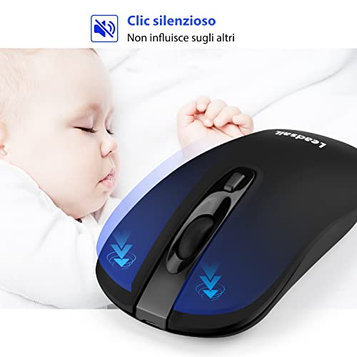 LeadsaiL Mouse Wireless Ricaricabile, Mouse Ottico Mini Silenzioso con Clic Mute, Ergonomic Mouse Senza Fili 2,4G con Nano Ricevitore, Cavo USB, 2400 DPI Mouse USB - Nero