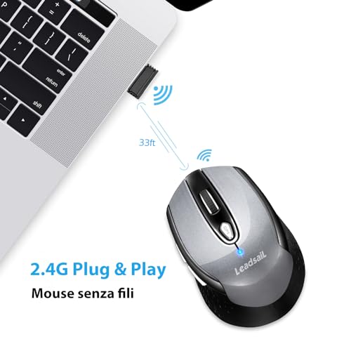 【Semplice Utilizzo e Ampia Compatibilità】 Avvio immediato, senza il bisogno di software o firmware addizionali.Il mouse wireless LeadsaiL lavorà con sistemi Windows2000/ME/7/8/10/XP, Mac, Linux, Vista e altri computer con interfaccia USB.È adatto per Notebook, PC Personali, Laptop, Computer, Macbook.Nota bene: i pulsanti laterali non sono disponibili sotto sistemi Mac OS, le altre funzioni possono essere normalmente utilizzati.
