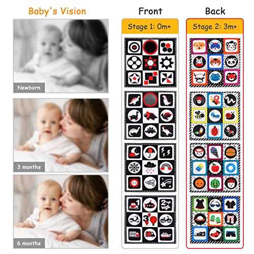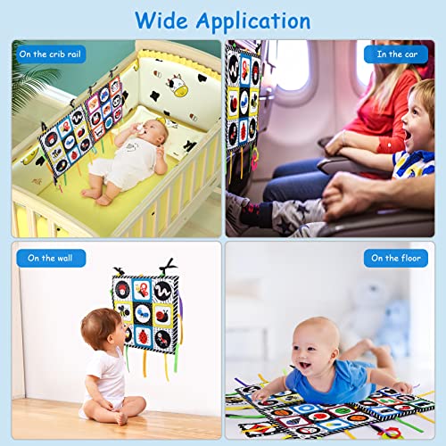 【Design Pratico del Cinturino】12 cinturini colorati e morbidi sono cuciti attorno a ciascun tappetino bambini da attività in bianco e nero, con i quali puoi legare insieme tutti e quattro i tappetini da attività e trasformarli in un enorme tummy time tappetino per aiutare i bambini a rafforzare i muscoli delle gambe e delle braccia o impilarli insieme per diventare un enorme libro bianco e nero per neonati della pancia del bambino per l'apprendimento e la