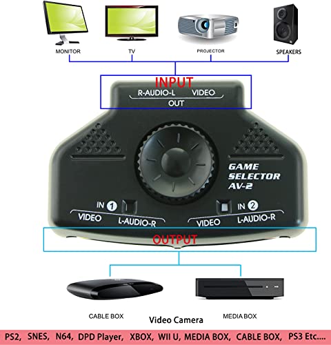 LEAGY, sdoppiatore con alloggiamento dotato d'interruttore di selezione a 2 vie, per audio e video, con cavo RCA per video CD, DVD, videocamere, registratori e videogame