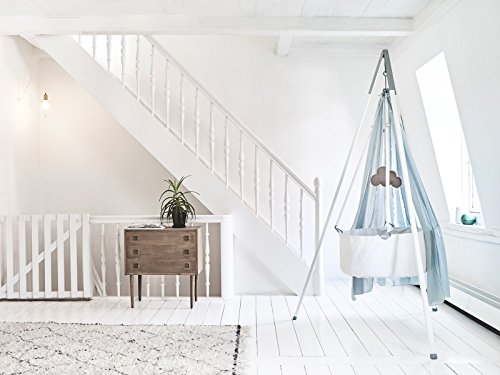 Contenuto della confezione: Culla Leander con materasso Träumeland e baldacchino misty blu + gancio da soffitto + treppiedi in bianco