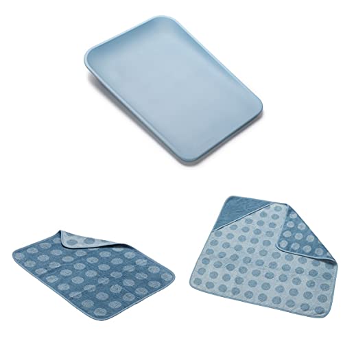 Contenuto della confezione: 1 cuscino fasciatoio Leander Matty in colore blu pallido + topper blu polvere + cappuccio blu polvere