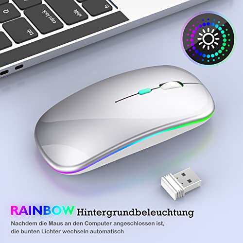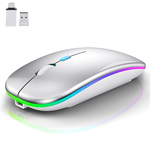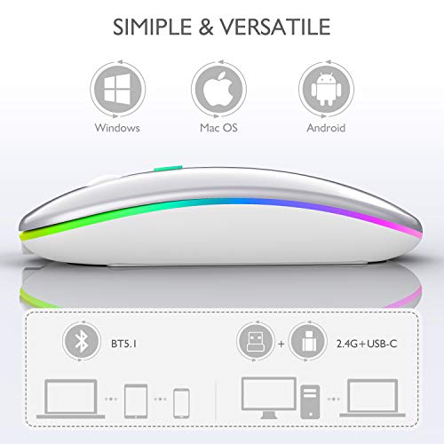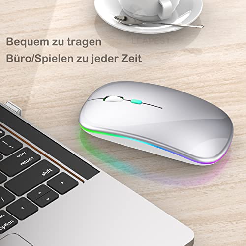 LEAPEST Mouse Bluetooth senza fili a LED, ricaricabile portatile da ufficio ottico (Bluetooth 5.0 + USB) 2,4 GHz, mouse per MacBook Air Pro, iPad, Mac, PC, computer, laptop, desktop (argento)