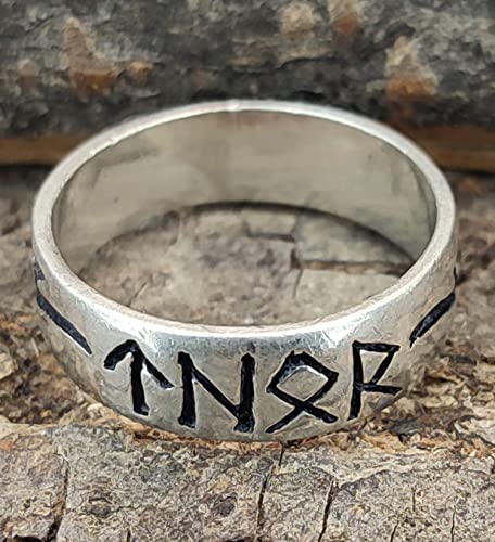 Anello vichingo in argento sterling 925. L'anello riporta la scritta "Thor" in rune ed è inoltre decorato con due flash.