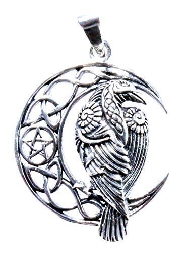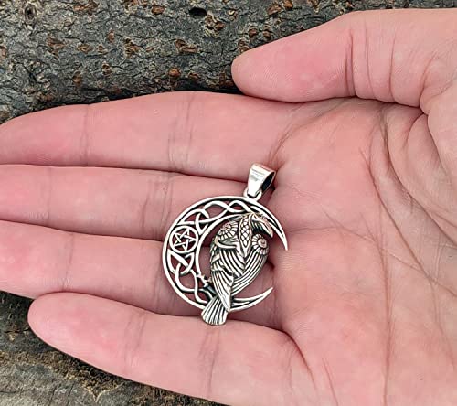 Ciondolo a forma di corvo in argento sterling 925. L'uccello è seduto su una falce di luna decorata con nodi celtici e un pentagramma.