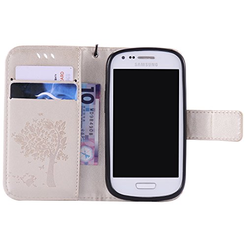 Leather Case Cover Custodia per Samsung Galaxy S3 mini i8190 S3mini, Ecoway Caso / copertura / telefono / involucro gatto farfalla Albero in rilievo Disegno retro della del modello PU con a Bookstyle tasche carte di credito funzione con interno morbido in TPU Portafoglio Supporto Slot Schede Protettiva Bumper Caso, Leather Case Cover Custodia - Golden