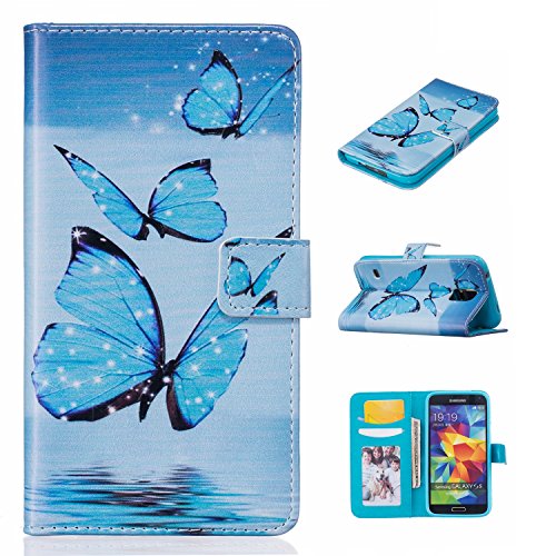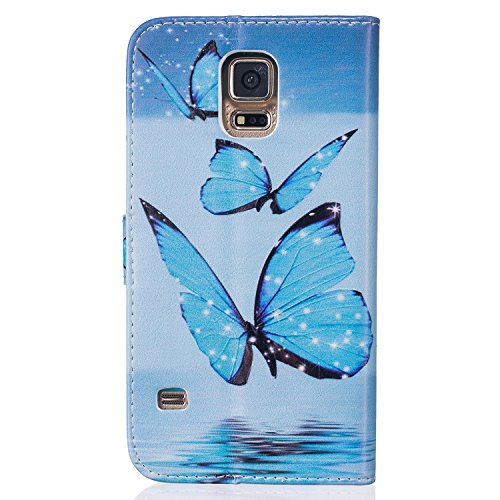 Leather Case Cover Custodia per Samsung Galaxy S5 SV I9600 G900, Ecoway Caso / copertura / telefono / involucro Modello retrò colorato del modello PU con a Bookstyle tasche carte di credito funzione con interno morbido in TPU Portafoglio Supporto Slot Schede Protettiva Bumper Caso - blue Butterfly
