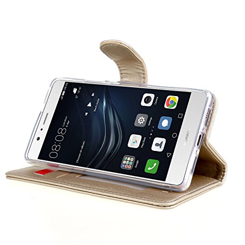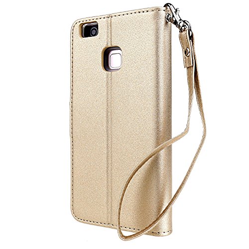 Leathlux Huawei P9 Lite Oro Custodia, Puro Colore Modello Design Con Cinturino da Polso Magnetico Snap-on Book style Internamente Silicone TPU Custodie Case in pelle Protettiva Flip Cover per Huawei P9 Lite 5.2"