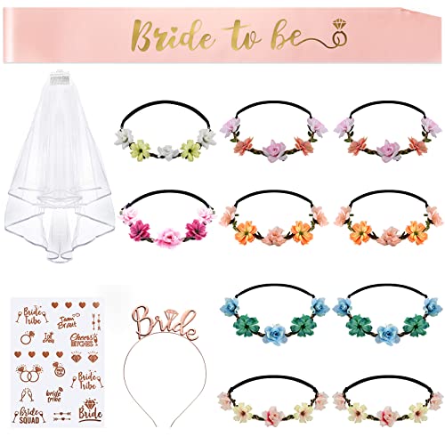 Lecone Addio al Nubilato Gadget Sposa, 14 Pezzi Addio al Nubilato Decorazione Sposa Bride to be Satin Sash Coroncine Fiori per Capelli Fascia e Velo da Sposa Addio al Nubilato con Team Bride Tatuaggi