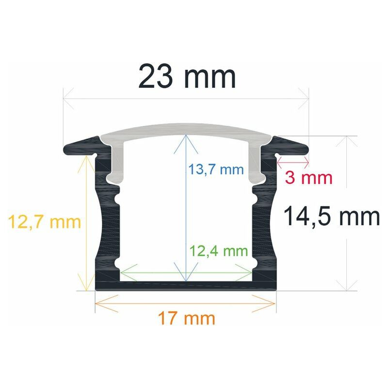 Barra profilata da incasso a LED in alluminio anodizzato 23 mm. x 14,5 mm. per l'inserimento di una striscia LED all'interno. Adatto per soffitti e pareti in cartongesso, gesso e cartongesso. Fornito in barre da 2 metri Due coperti per bar Diffusore opalino da 2 metri incluso