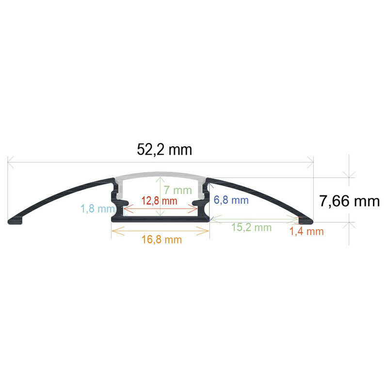 Barra profilata a LED montata in superficie, in alluminio anodizzato, 52,2 mm. × 7,66 mm. da posizionare su una superficie con una striscia LED all'interno. Fornita in barre da 2 m. Due tappi per barra. Quattro clip per barra. Diffusore opale da 2 m