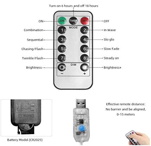selezionare la vostra modalità preferita tra 8 modalità di illuminazione: combinazione, in onda, sequenziale, lenta illuminazione, inseguimento/flash, dissolvenza lenta, scintillio/flash, fissa. La luce sarà accesa 6 ore e 18 ore spenta quando si preme il pulsante "Timer" del telecomando;
