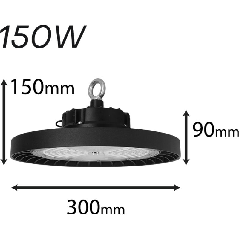 Un Faro Led Industriale Professionale,High Bay Light Modello UFO,Disco Rotondo,Impermeabile IP65 uso anche esterno Diametro 300mm, Altezza 90mm, Pesa 2100g, Angolo Luce 90° Alta luminosità 160lm/W, 150W 220V,24000 Lumen Totale, Colorazione Bianco Neutro 4000K Sostitusce prodotti LEDLUX SKU: FE1500N e FE1502N 2 Potenza Disponibile:150W (SKU: FE4150N) e 200W (SKU: FE4200N);