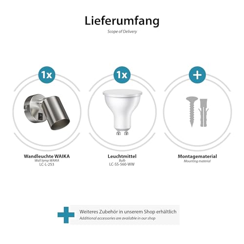 Ledscom.de Spot a parete WAIKA, luce singola, con interruttore, GU10, cromo opaco, incl. lampada LED GU10 (bianco caldo, 6,826W, 630lm, 100°)