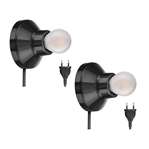 Ledscom.de Presa a muro in porcellana E27 Elektra, interruttore a spina rotondo, nero 90mm + lampada LED ciascuno 477lm bianco caldo opaco, 2pcs.