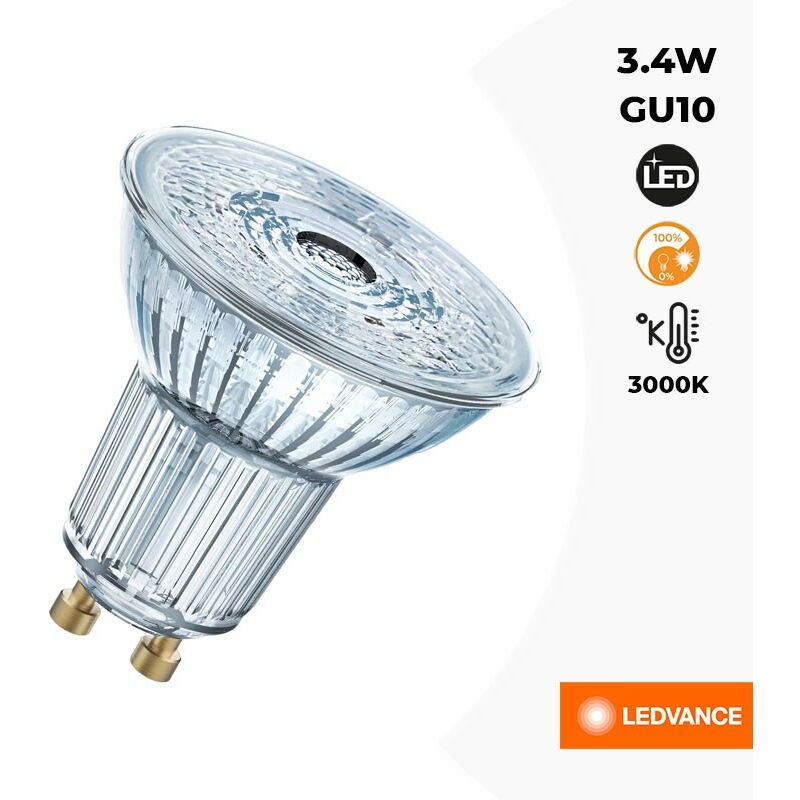 PARATHOM PRO PAR16 35 GU10 36° 3,4W 3000K bianco caldo - Dimmerabile, è l'alternativa perfetta alla lampadina alogena GU10. Si tratta di una lampadina spot con un diametro di 51 mm. La lampada funziona a 224 V e non necessita di trasformatore. Passando ai LED otterrete numerosi vantaggi! È possibile risparmiare fino al 90% sui costi energetici e di manutenzione, grazie al basso consumo energetico di 3,4W e alla durata di 25000 ore. Le tradizionali lampadine alogene GU10 durano solo 2000 ore. L'illuminazione a LED non si riscalda e non emette radiazioni UV. Kelvin: 3000K CRI: ≥97 Potenza: 3,4 W Presa: GU10 Dimmerabile: Sì