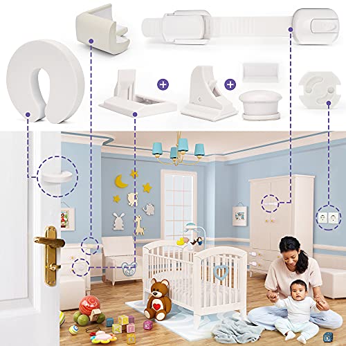 Contenuto della confezione: il set di sicurezza per bambini include 10 protezioni per prese di corrente, 8 protezioni per i bordi del tavolo, 4 serrature magnetiche per armadi, 4 cinghie per cassetti, 4 fermaporta, 1 strumento di aiuto per serratura magnetica, 1 strumento di bloccaggio magnetico per bloccare gli utensili
