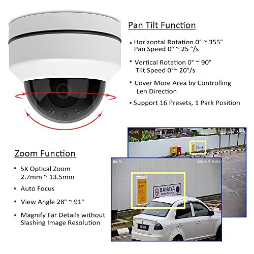 verticale: 0-90 °, velocità di inclinazione 0-20 ° / s. Zoom ottico 5X 2,7-13,5 mm. Con la funzione PTZ, avrai una copertura di sorveglianza completa e ingrandirai i dettagli di 5 volte più grandi senza diminuire la risoluzione dell'immagine.
