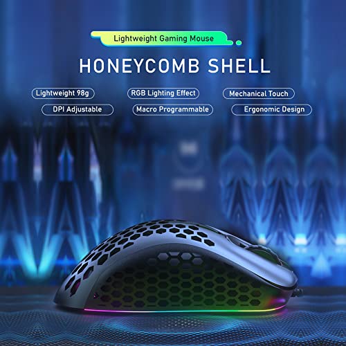 Aula F810 Leggero Mouse Gamer, con Retroilluminazione RGB, Guscio a nido d'ape Design, Pulsanti Laterali, 6400 DPI Ergonomico USB Cablato Gaming Topo da Gioco per PC, Laptop Computer (Nero)