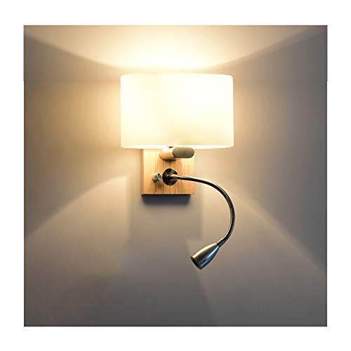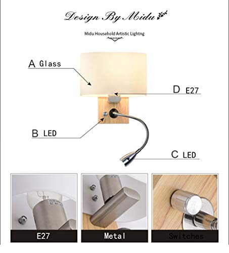 HNYD Applique stile nordico: paralume in materiale di vetro, sorgente luminosa a LED, parete hardware, corpo lampada in metallo, resistente alla ruggine resistente all'usura, telaio in legno, con interruttore, flessibile a collo di cigno LED Lampada da lettura a colori: caldo (3000K).