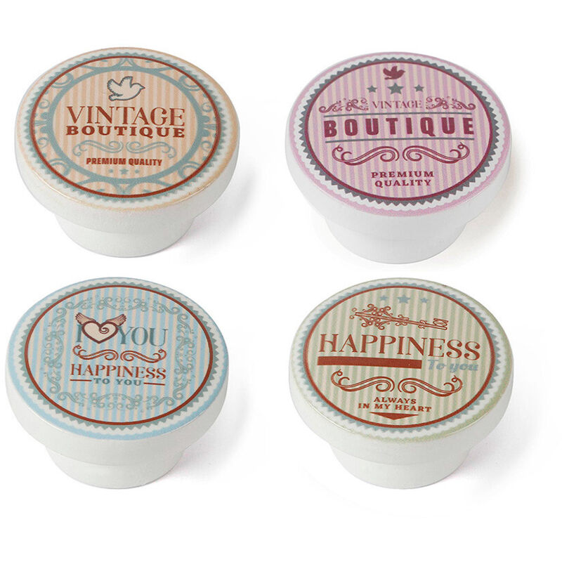 Blister con 4 pomelli tondi per mobili in stile contemporaneo laccati di bianco e con una bella illustrazione ideale per dare un tocco decorativo a qualsiasi tipo di stanza maniglia per anta o cassetto per tutti i tipi di mobili ø38mm realizzato in legno di faggio proveniente da foreste sostenibili con finitura illustrata facile installazione con viti con filettatura metrica m4 incluse dimensioni: ø38x22mm (diametro/profondità) comprende 4 unità. Produttore: REI