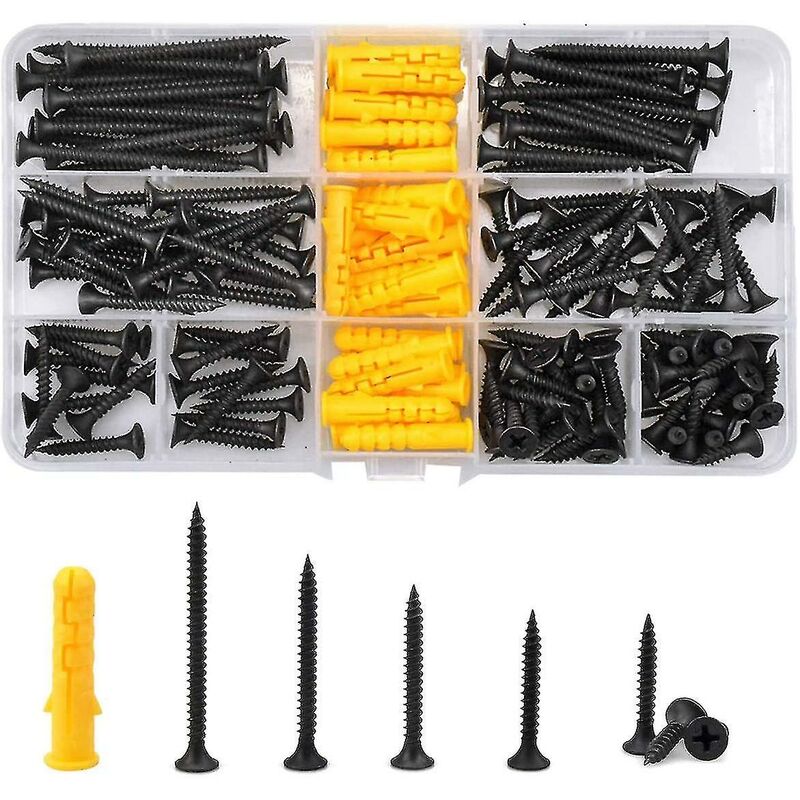 Contenuto: 140 viti per cartongesso autofilettanti e 30 viti a espansione. .Materiale: tutte le viti sono realizzate in acciaio al carbonio, con finitura in ossido nero, resistente alla ruggine e alla corrosione anche in ambienti umidi, belle e pratiche. .La superficie della vite filettata è liscia e senza sbavature. Buone prestazioni di fissaggio quando installato su pali in legno, legno su legno, soffitto e altro, non scivola facilmente durante l'installazione. .Il set include 7 taglie: M3.5*16mm (20 pezzi) M3.5*20mm (20 pezzi) M3.5*25mm (20 pezzi) M3.5*30mm (20 pezzi) M3.5*35mm (20 pezzi) M3.5 *40mm (20pz) M3.5*50mm (20pz). .Ideale per un'ampia varietà di lavoratori e officine, dagli idraulici agli installatori professionisti e hobbisti. .